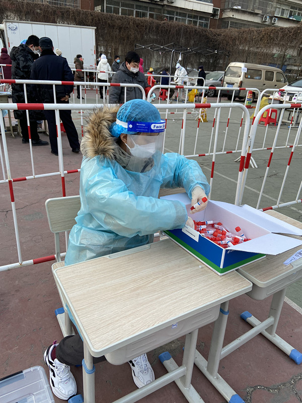 张美娜,中共党员,人事处干部,参加西青区精武镇燕南园社区核酸筛查志愿服务,主动到社区报到,参与完成核酸筛查现场入口测温、查看居民健康码、核实登记居民身份信息等。